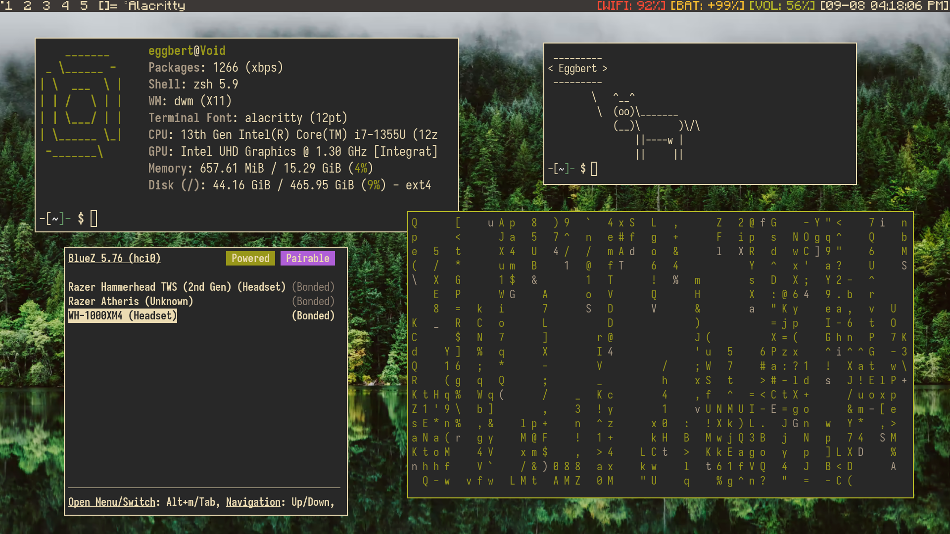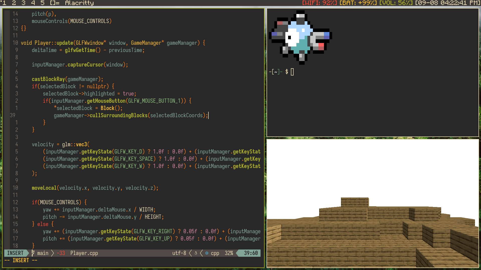As for specifics on other programs, I mentioned slstatus which is a status bar (helper) for dwm. Every module is just a simple c program that pulls the data from some external file or script and feeds it into the status bar, specified by the config file. I also took the liberty of applying the Minecraft game font as my dwm bar font, which is always a good conversation starter.
